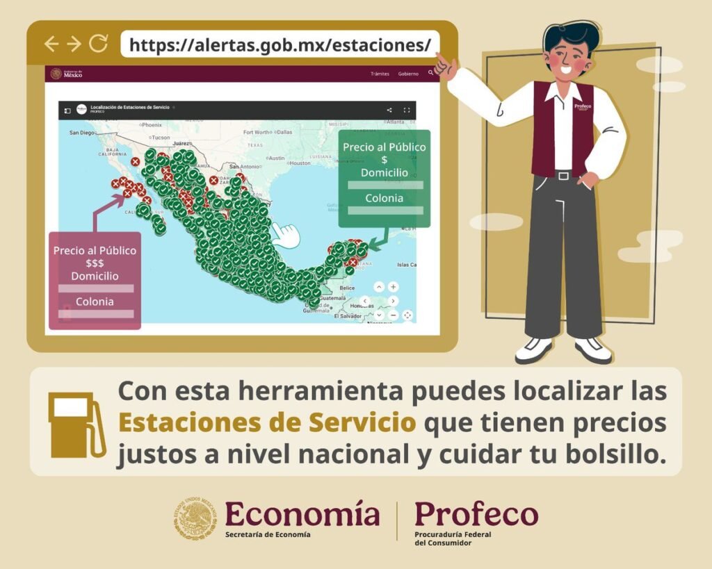 La herramienta fue difundida por la Procuraduría Federal del Consumidor (Profeco) y está disponible en el portal alertas.gob.mx, donde los usuarios pueden revisar la ubicación de las estaciones y el precio al público del combustible.