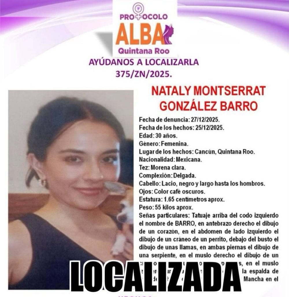 CANCÚN, QRoo., a 29 de diciembre de 2025.- La Fiscalía General de Quintana Roo confirmó el hallazgo sin vida de Nataly Montserrat “N”, por quien la dependencia había emitido una ficha de búsqueda bajo el Protocolo Alba.